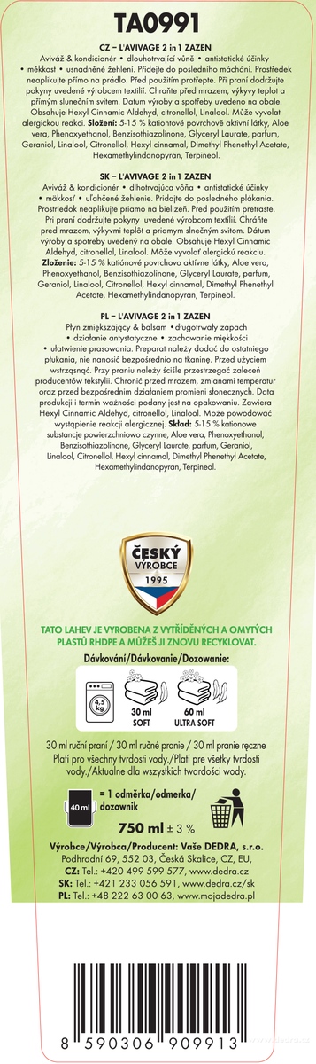 vivážny kondicionér L'AVIVAGE 2in1 je dvojzložkový antistatický, zmäkčovací a parfumovaný prostriedok, ktorý sa pridáva do posledného plákania v práčke alebo pri ručnom praní.
